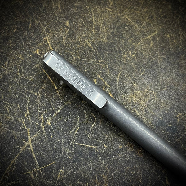 OZ "Little John" Titanium Pen with Dark Stonewashed body, stonewashed pusher and clip, and satin screws. Engraved clip. No grip engraving.
