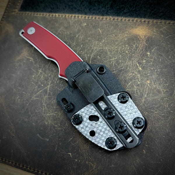 1 Roosevelt fixed blade + Kydex sheath setup with Ulti Clip in this configuration: 63-64 HRC stonewashed MagnaCut blade, red G10 scales, stonewashed Titanium T8 screws. No "opening hole" detail.