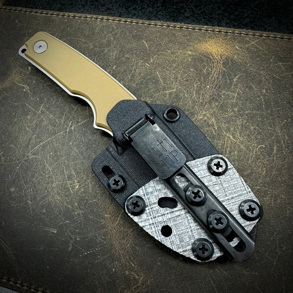 1 standard size Roosevelt Fixed Blade in this configuration: 63-64 HRC stonewashed MagnaCut blade, Coyote Brown G10 scales, stonewashed screws. Kydex sheath with UltiClip.