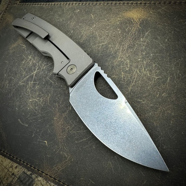 1 XL Roosevelt in this configuration: 63-64 HRC stonewashed XHP blade, matte bronze angle milled scales and clip, stonewashed bronze backspacer and hardware. All Titanium construction.