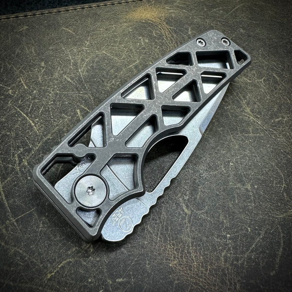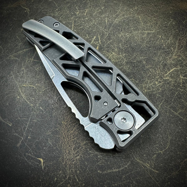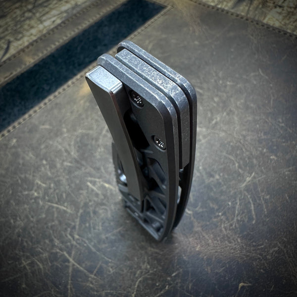 1 standard size Roosevelt in this configuration: 61-62 HRC Stonewashed Vanax blade. Dark stonewashed skeleton milled scales. Dark stonewashed backspacer. Stonewashed hardware and clip. All Titanium construction.