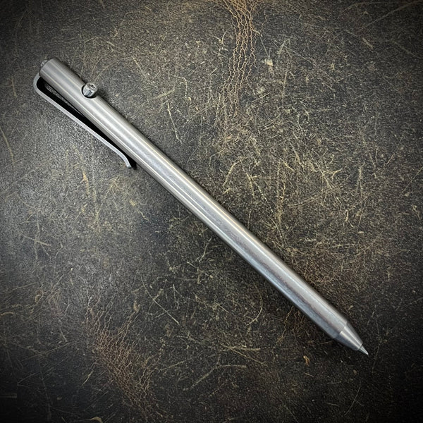 OZ Machine Company "Long John" titanium pen with engraved clip. No grip engraving (smooth body). Stonewashed finish.