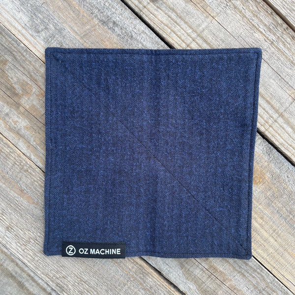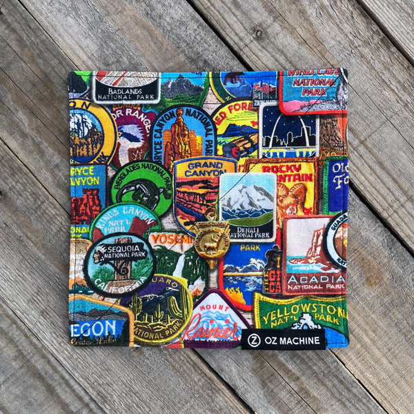 OZ Mini Hank. Navy blue cotton flannel shirting on one side. National Parks patterned quilting cotton on the other side.