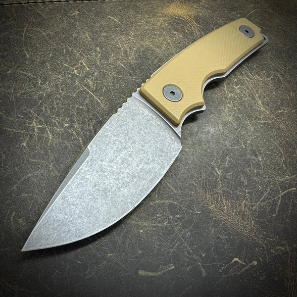 1 standard size Roosevelt Fixed Blade in this configuration: 63-64 HRC dark stonewashed MagnaCut blade, Coyote Brown G10 scales, dark stonewashed screws. Kydex sheath with UltiClip.