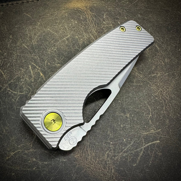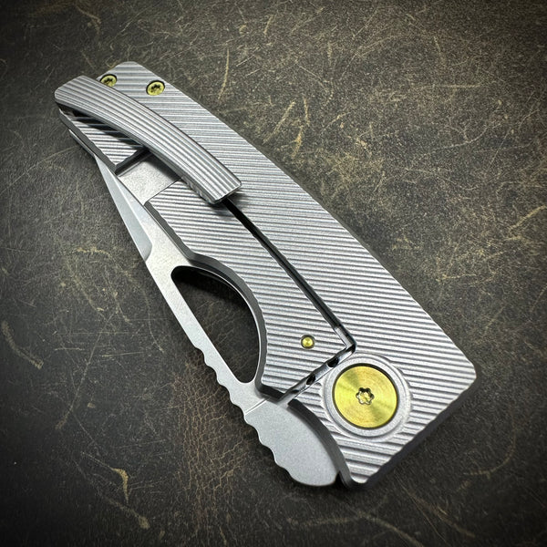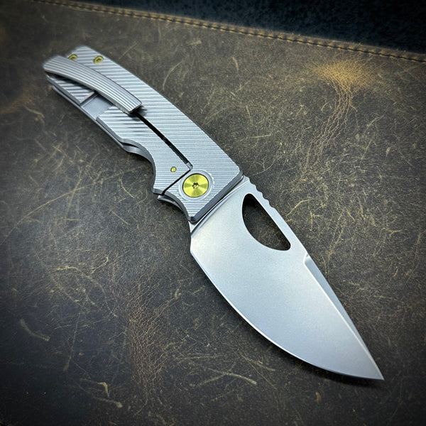 1 Standard Size Roosevelt in this configuration: 63-64 HRC zirblasted XHP blade. Zirblasted Angle milled scales. Zirblasted clip and backspacer. Gold anodized satin hardware.