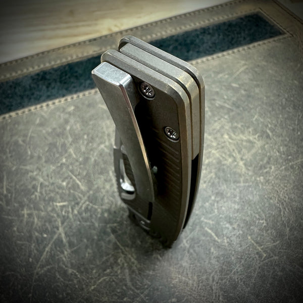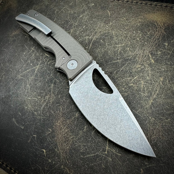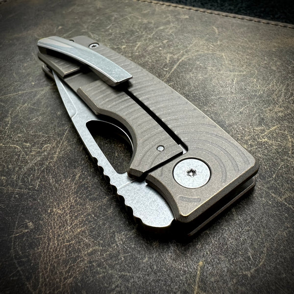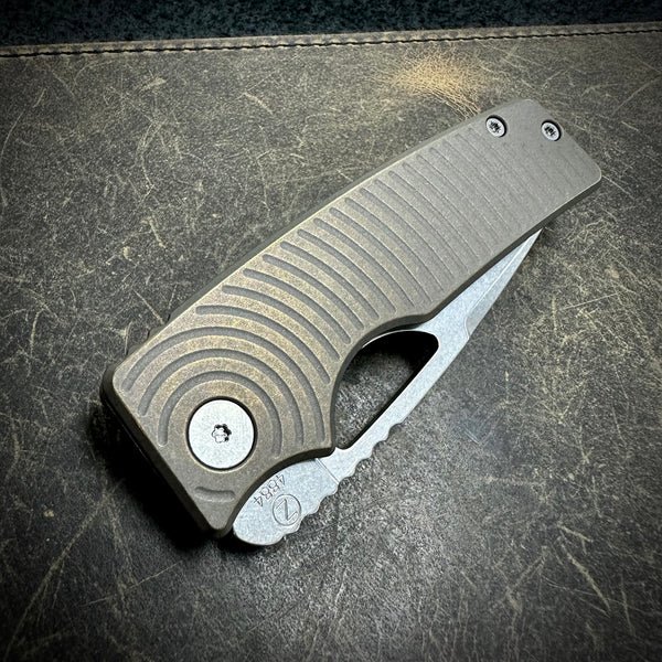 1 Standard Size Roosevelt in this configuration: 62-63 HRC stonewashed S45VN blade, bead blasted and stonewashed bronze anodized backspacer and Radial milled scales. Stonewashed clip and hardware. All Titanium construction.